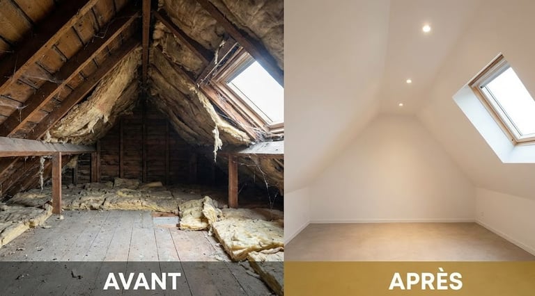 Légende : Transformation de combles perdus en une pièce de vie lumineuse et parfaitement isolée.