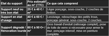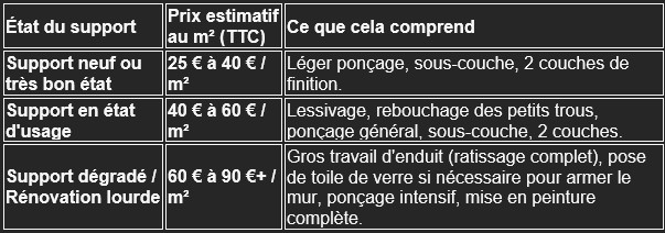 Les prix varient énormément en fonction de l'état initial de vos murs. Un mur neuf en placo demande moins de travail qu'un vieux mur en plâtre fissuré.