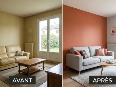 Légende : Transformation d'un salon daté grâce à une couleur terracotta moderne sur le mur du fond et un gris clair sur les murs latéraux.